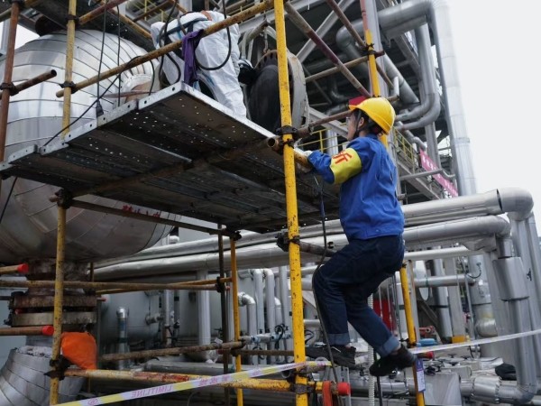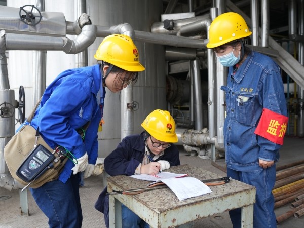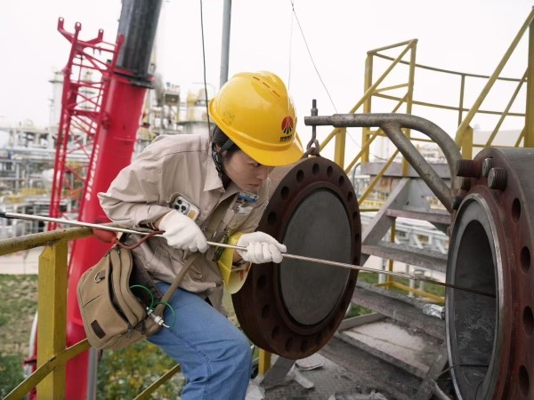 在彬州公司中修現(xiàn)場,他們是嚴謹?shù)摹鞍踩l(wèi)士”。頭戴黃色安全帽,臂佩“分析”袖章,專注檢測設(shè)備,用儀器探尋隱患。無論是管道閥門,還是罐體孔洞,每一處都細致排查。攀爬、蹲守,記錄數(shù)據(jù),他們以專業(yè)與認真,守護生產(chǎn)安全,筑牢化工生產(chǎn)的“安全防線” 。
